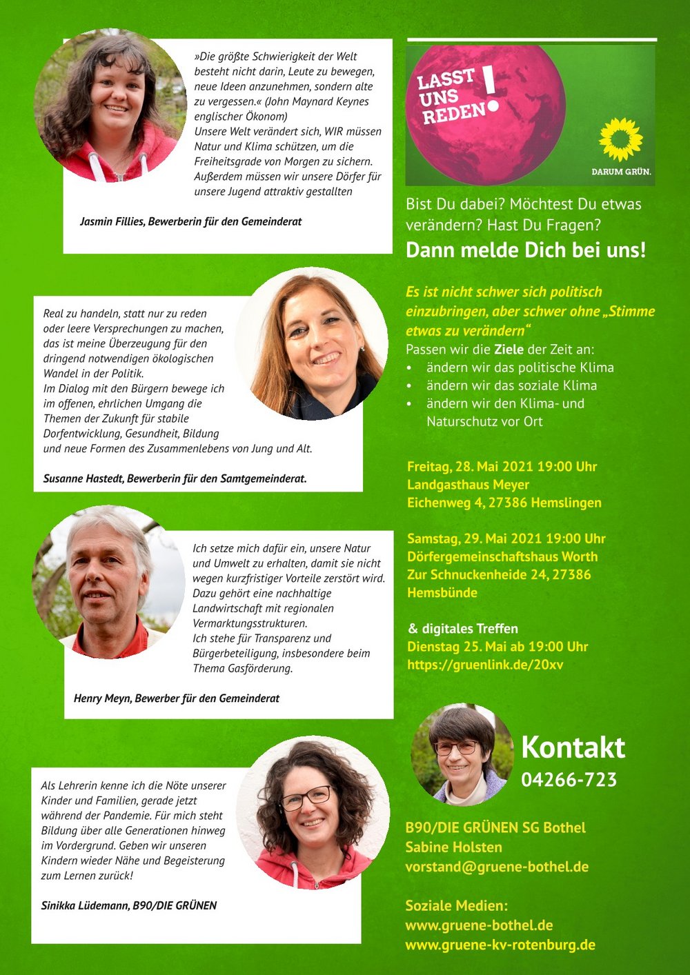 Dazu bieten wir Euch / Ihnen drei Termine, zwei Präsenzveranstaltungen und eine digitale Veranstaltung. Wir starten am Dienstag, den 25.05. um 19 Uhr mit dem digitalen Treffen per Zoom https://gruenlink.de/20xv.